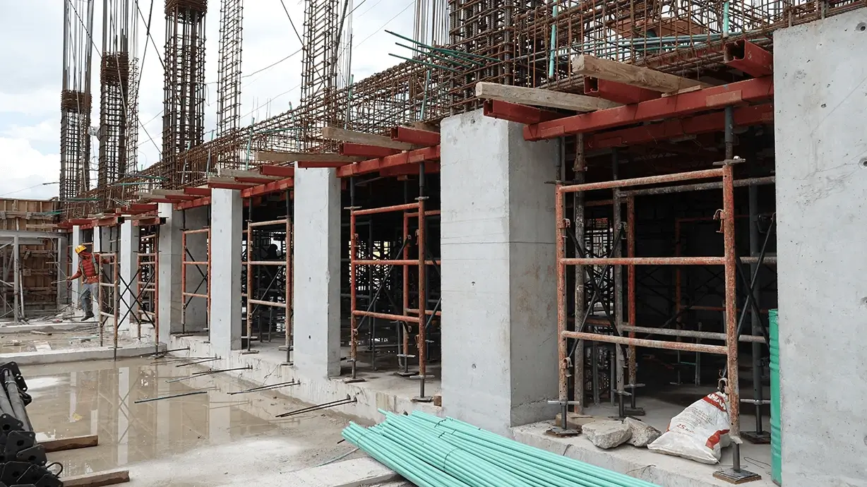 Torre residencial de 27 niveles con columnas, cimbra y apuntalamiento para losas y trabes.